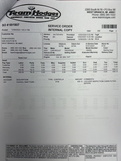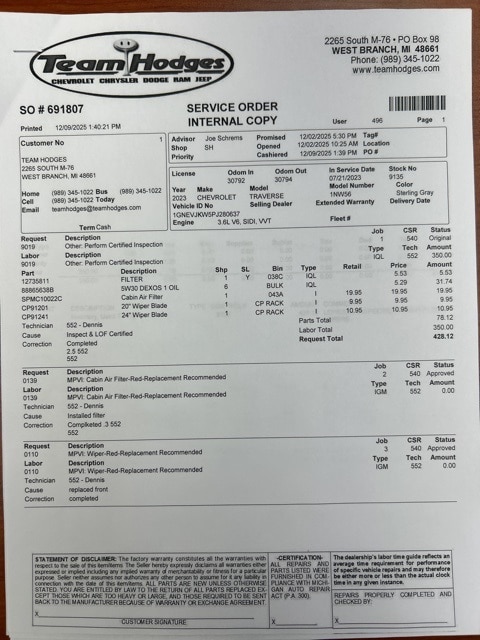 Inspection completed, oil and filter changed, cabin air filter replaced, wiper blades replaced, total reconditioning $578.