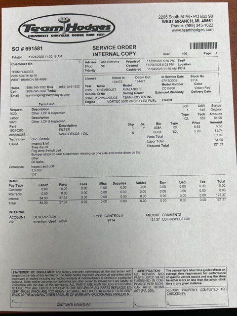 Inspection completed, oil and filter changed, total reconditioning $271.