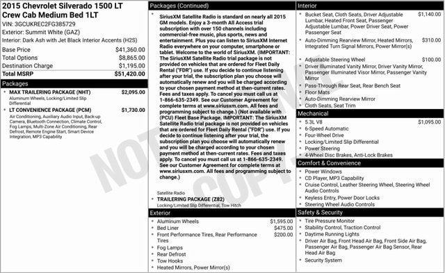 6-Speed Automatic Electronic with Overdrive, 4WD, Dark Ash With Jet Black Interior Accents Cloth, 110-Volt AC Power Outlet, 150 Amp Alternator, 3.73 Rear Axle Ratio, 4.2" Diagonal Color Display Driver Info Center, 6 Speaker Audio System, Bluetooth® For Phone, Body Color Bodyside Moldings, Body Color Door Handles, Body-Color Mirror Caps, Body-Color Power Adjustable Heated Outside Mirrors, Chrome Grille w/Chrome Surround, Color-Keyed Carpeting w/Rubberized Vinyl Floor Mats, Deep-Tinted Glass, Driver & Front Passenger Illuminated Vanity Mirrors, Dual-Zone Automatic Climate Control, Electric Rear-Window Defogger, Enhanced Cooling Radiator, EZ Lift & Lower Tailgate, Front Chrome Bumper, Front Halogen Fog Lamps, Heavier Duty Rear Springs, Heavy-Duty Rear Locking Differential, Increased RGAWR, Integrated Trailer Brake Controller, Leather Wrapped Steering Wheel w/Cruise Controls, LT Convenience Package, Manual Tilt Wheel Steering Column, Max Trailering Package, OnStar 6 Months Directions & Connections Plan, OnStar w/4G LTE, Power Windows w/Driver Express Up, Preferred Equipment Group 1LT, Radio: AM/FM 8" Diagonal Color Touch Screen, Rear 60/40 Folding Bench Seat (Folds Up), Rear Chrome Bumper, Rear Vision Camera w/Dynamic Guide Lines, Rear Wheelhouse Liners, Remote Keyless Entry, Remote Vehicle Starter System, Single Slot CD/MP3 Player, SiriusXM Satellite Radio, Steering Wheel Audio Controls, Theft Deterrent System (Unauthorized Entry), Trailering Equipment, Wheels: 18" x 8.5" Bright-Machined Aluminum.