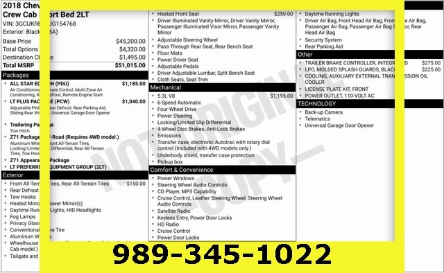 6-Speed Automatic Electronic with Overdrive, 4WD, Black Cloth, 110-Volt AC Power Outlet, All Star Edition, Dual-Zone Automatic Climate Control, Electric Rear-Window Defogger, Heated Driver & Front Passenger Seats, LT Plus Package, Power Adjustable Pedals, Power Sliding Rear Window, Remote Vehicle Starter System, Theft Deterrent System (Unauthorized Entry), Trailering Package, Ultrasonic Rear Park Assist, Universal Home Remote.