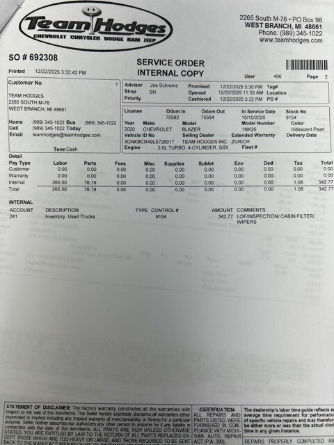 Inspection completed, oil and filter changed, cabin air filter replaced, replaced rear wiper, total reconditioning $492.