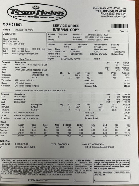 Inspection completed, oil and filter changed, replaced rear pads and rotors, total reconditioning $841.