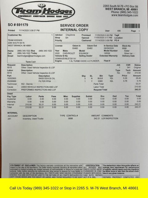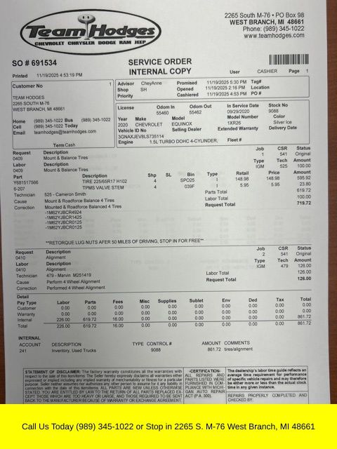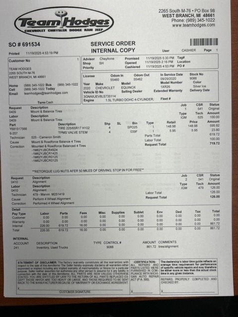 Inspection completed. oil and filter changed, mount and balance 4 tires, performed 4 wheel alignment, total reconditioning $1,253.