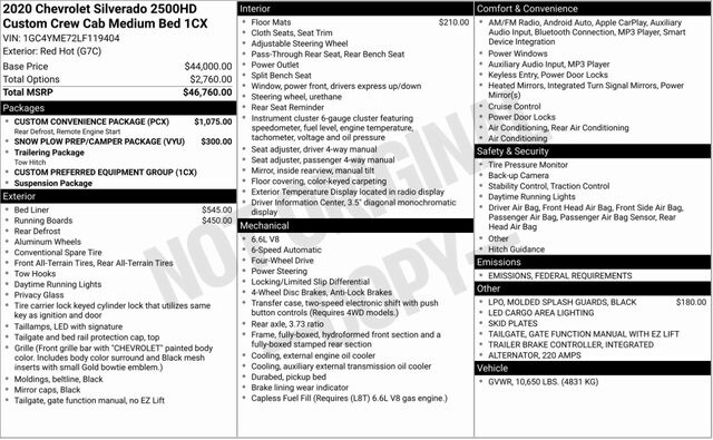 Red Hot 2020 Chevrolet Silverado 2500HD Custom 4WD 6-Speed Automatic 6.6L V8 6-Speed Automatic, 4WD, Black Cloth, 170 Amp Alternator, 2-Speed Electronic Shift Transfer Case, 3.5" Diagonal Monochromatic Display DIC, Black Mirror Caps, Bluetooth® For Phone, Body Color Front Grille, Color-Keyed Carpeting Floor Covering, Custom Convenience Package, Deep-Tinted Glass, Electric Rear-Window Defogger, Electronic Cruise Control w/Set & Resume Speed, Front Rubberized Vinyl Floor Mats, Heated Vertical Trailering Mirrors, Integrated Trailer Brake Controller, LED Cargo Area Lighting, Locking Tailgate, Manual Tailgate Function w/EZ Lift, Manual Tailgate Function w/No EZ Lift, Manual Tilt-Wheel Steering Column, Power Door Locks, Power Front Windows w/Driver Express Up/Down, Power Front Windows w/Passenger Express Down, Power Rear Windows w/Express Down, Preferred Equipment Group 1CX, Rear 60/40 Folding Bench Seat (Folds Up), Rear Rubberized Vinyl Floor Mats, Remote Keyless Entry, Remote Vehicle Starter System, Snow Plow Prep/Camper Package, Suspension Package.
