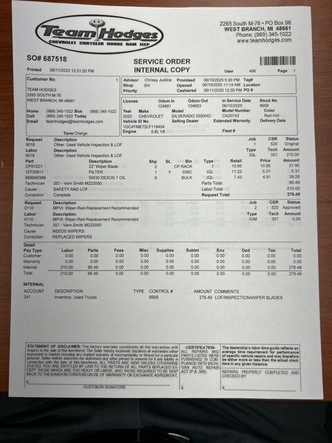 Inspection complete, oil and filter changed, replaced both wiper blades, total reconditioning $426.
