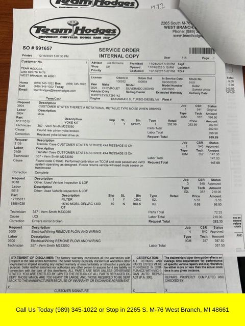 Inspection completed, replaced rear pinion seal, oil and filter changed, total reconditioning $1,656.