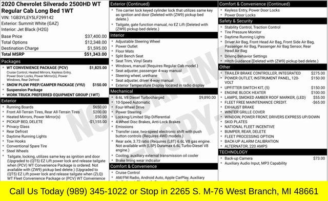 Summit White 2020 Chevrolet Silverado 2500HD Work Truck 4WD 10-Speed Automatic Duramax 6.6L V8 Turbodiesel 10-Speed Automatic, 4WD, Jet Black Vinyl, 170 Amp Alternator, 2-Speed Electronic Shift Transfer Case, 3.5" Diagonal Monochromatic Display DIC, Black Front Bumper, Black Front Grille, Black Mirror Caps, Black Rear Bumper, Bluetooth® For Phone, Deep-Tinted Glass, Electric Rear-Window Defogger, Electronic Cruise Control w/Set & Resume Speed, High-Visibility Vertical Trailering Mirrors, Locking Tailgate, Manual Door Locks, Manual Tailgate Function w/No EZ Lift, Manual Tilt-Wheel Steering Column, Manual Windows, Power Door Locks, Power Front Windows w/Driver Express Up/Down, Power Front Windows w/Passenger Express Down, Preferred Equipment Group 1WT, Remote Keyless Entry, Rubberized-Vinyl Floor Covering, Snow Plow Prep/Camper Package, Solar Absorbing Tinted Glass, Suspension Package, WT Convenience Package.