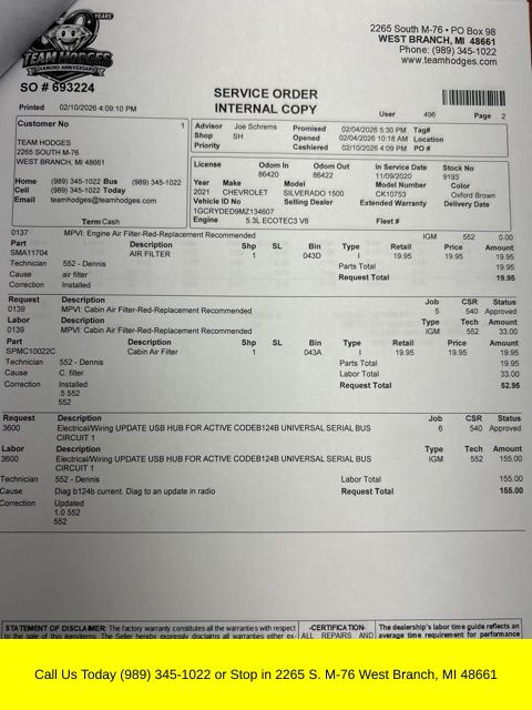Inspection completed, oil and filter changed, replaced wiper blades, cabin, and engine air filters, repaired damage to the tailgate, total reconditioning $1,345.