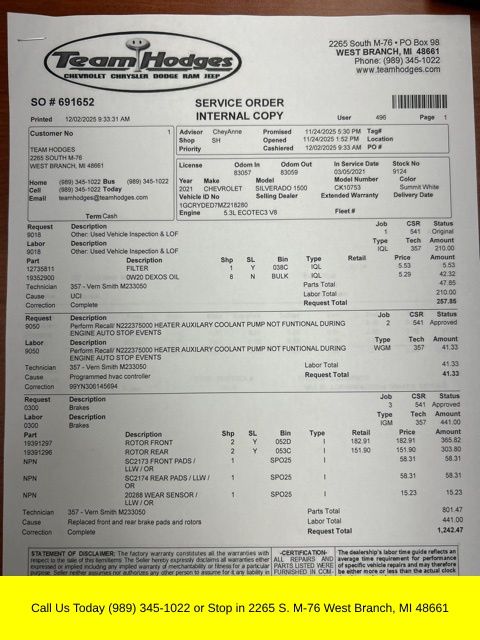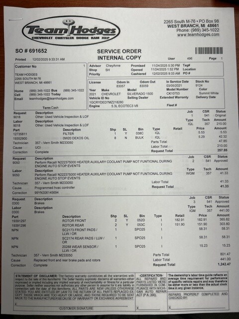 Inspection completed, oil and filter changed, programmed HVAC controller, installed new front and rear brake pads and rotors, replaced idler pulley, total reconditioning $1,846.00