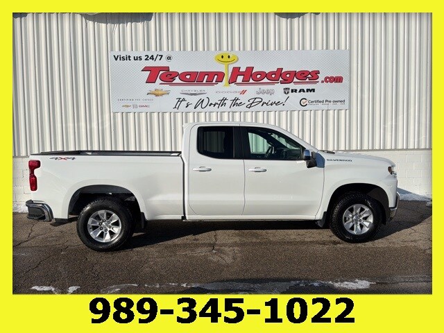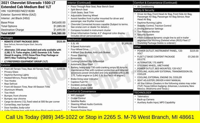 Summit White 2021 Chevrolet Silverado 1500 LT LT1 4WD 8-Speed Automatic EcoTec3 5.3L V8 8-Speed Automatic, 4WD, Black Cloth, 10-Way Power Driver Seat w/Lumbar, 12-Volt Rear Auxiliary Power Outlet, 2 USB Ports (First Row), 4.2" Diagonal Color Display Driver Info Center, 4G LTE Wi-Fi Hot Spot Capable, All-Star Edition, Auto-Locking Rear Differential, Bluetooth® For Phone, Chevrolet Connected Access Capable, Chrome Grille, Chrome Mirror Caps, Color-Keyed Carpeting Floor Covering, Compass, Convenience Package, Deep-Tinted Glass, Dual-Zone Automatic Climate Control, Electric Rear-Window Defogger, Electrical Lock Control Steering Column, Electronic Cruise Control, EZ Lift Power Lock & Release Tailgate, Front Frame-Mounted Black Recovery Hooks, Front Rubberized Vinyl Floor Mats, Heated Driver & Front Outboard Passenger Seats, Heated Steering Wheel, Hitch Guidance, Keyless Open & Start, Leather Wrapped Steering Wheel, LED Cargo Area Lighting, Manual Tilt/Telescoping Steering Column, OnStar & Chevrolet Connected Services Capable, Power Door Locks, Power Front Windows w/Driver Express Up/Down, Power Front Windows w/Passenger Express Down, Power Rear Windows w/Express Down, Preferred Equipment Group 1LT, Rear 60/40 Folding Bench Seat (Folds Up), Rear Dual USB Charging-Only Ports, Rear Rubberized-Vinyl Floor Mats, Rear Vision Camera, Remote Vehicle Starter System, SiriusXM Radio, Standard Tailgate, Steering Wheel Audio Controls, Theft Deterrent System (Unauthorized Entry), Trailering Package.