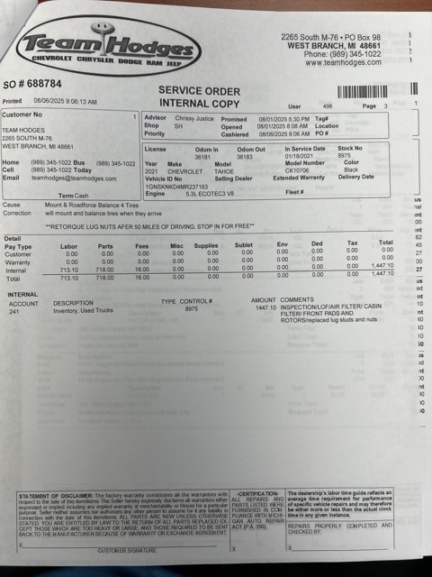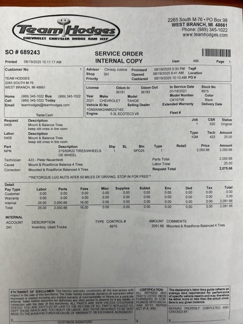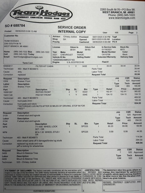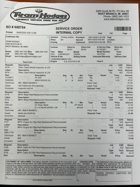 Inspection completed, oil and filter changed, replaced rear wiper blade, replaced both engine and cabin filer, replaced front brake pads and rotors, install 4 new tires and wheels, total reconditioning $3689