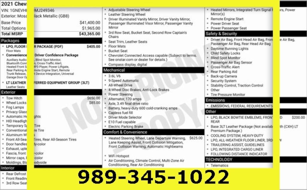 Mosaic Black Metallic 2021 Chevrolet Traverse LT Leather AWD 9-Speed Automatic 3.6L V6 SIDI VVT AWD, 1st & 2nd Row All-Weather Floor Liner (LPO), 3rd Row All-Weather Floor Liner (LPO), Automatic Emergency Braking, Automatic Heated Steering Wheel, Chevy Safety Assist, Floor Liner Package (LPO), Following Distance Indicator, Forward Collision Alert, Front Pedestrian Braking, Heavy-Duty Cooling System, Hitch Guidance w/Hitch View, Integrated Cargo Liner (LPO), IntelliBeam Auto High Beam Control Headlamps, Lane Keep Assist w/Lane Departure Warning, Preferred Equipment Group 3LT, Trailering Assist Guidelines, Trailering Equipment.