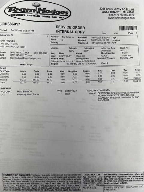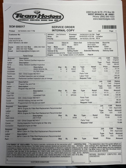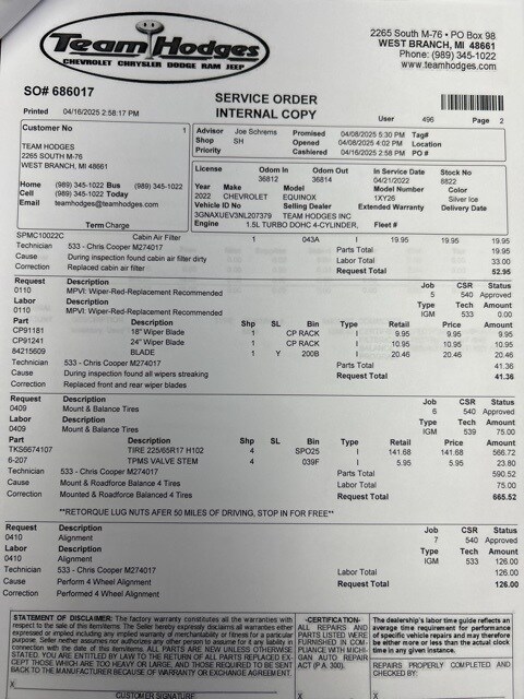 Inspection completed, oil and filter changed, programmed and cut 2nd key, replaced engine and cabin filter, replaced wiper blades, replaced all four tires, performed 4 wheel alignemnt, total reconditioning $1,718.