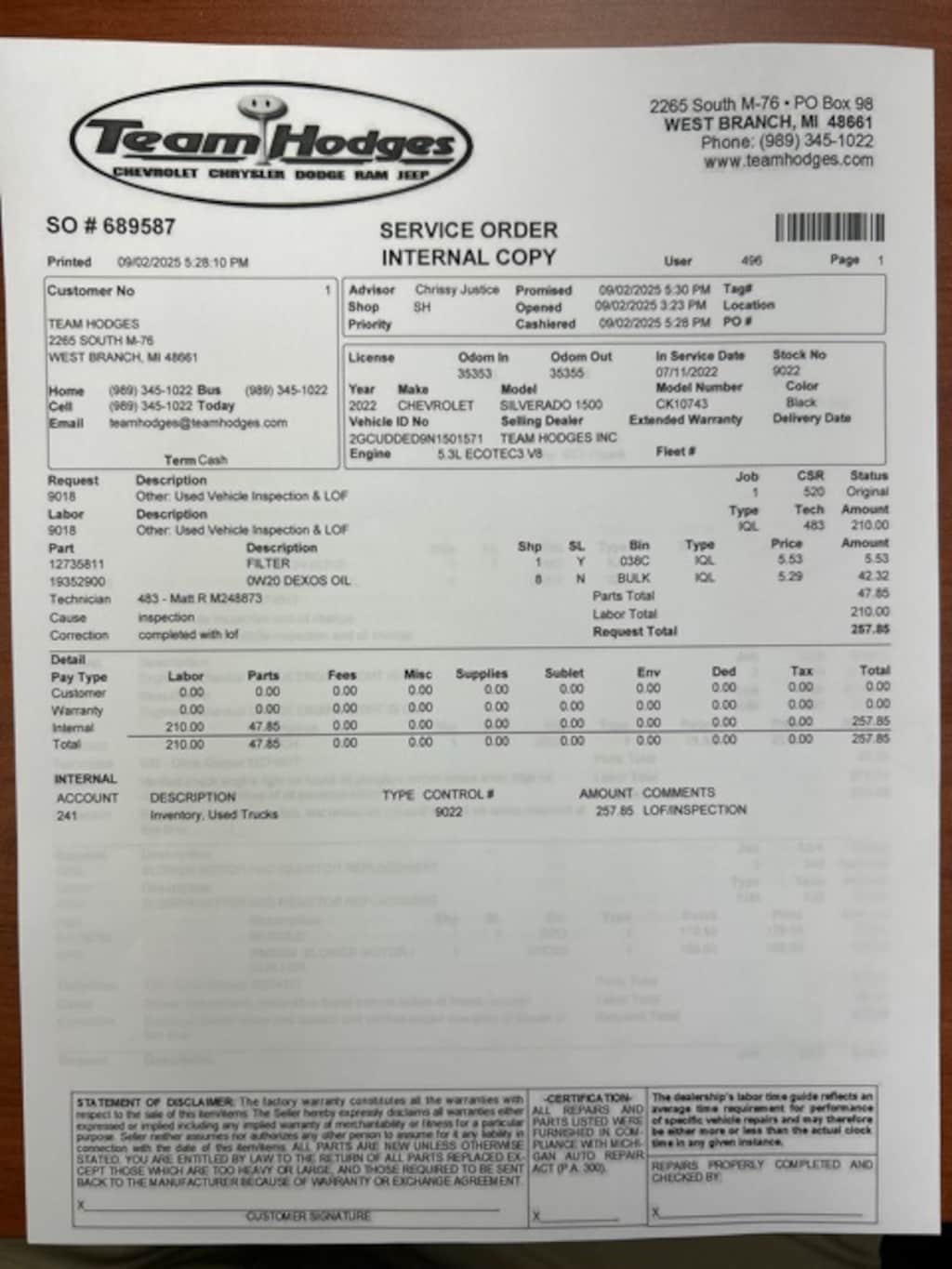 Inspection completed, oil and filter changed, total reconditioning cost $408.
