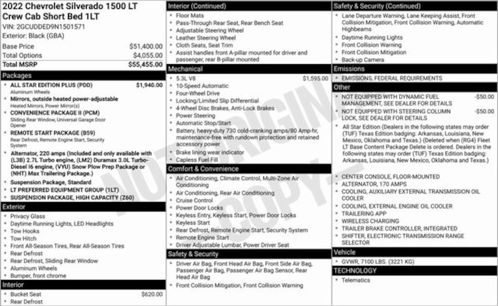 10-Speed Automatic, 4WD, Black Cloth, 10-Way Power Driver Seat w/Lumbar, 12.3" Multicolor Reconfigurable Digital Display, 120-Volt Bed Mounted Power Outlet, 120-Volt Instrument Panel Power Outlet, All Star Edition Plus, All-Star Edition, Auto-Locking Rear Differential, Bluetooth® For Phone, Chevrolet Connected Access Capable, Chrome Mirror Caps, Color-Keyed Carpeting Floor Covering, Compass, Convenience Package, Convenience Package II, Deep-Tinted Glass, Dual Rear USB Ports (Charge Only), Dual-Zone Automatic Climate Control, Electric Rear-Window Defogger, Electrical Steering Column Lock, Electronic Cruise Control, EZ Lift Power Lock & Release Tailgate, Front Frame-Mounted Black Recovery Hooks, Front Rubberized Vinyl Floor Mats, HD Rear Vision Camera, Heated Driver & Front Outboard Passenger Seats, Heated Power-Adjustable Outside Mirrors, Heated Steering Wheel, High Capacity Suspension Package, Hitch Guidance, Hitch Guidance w/Hitch View, Inside Rear-View Mirror w/Tilt, Integrated Trailer Brake Controller, Keyless Open & Start, Leather Wrapped Steering Wheel, LED Cargo Area Lighting, Manual Tilt/Telescoping Steering Column, OnStar & Chevrolet Connected Services Capable, Power Front Windows w/Driver Express Up/Down, Power Front Windows w/Passenger Express Down, Power Rear Windows w/Express Down, Power Sliding Rear Window w/Rear Defogger, Preferred Equipment Group 1LT, Rear 60/40 Folding Bench Seat (Folds Up), Rear Rubberized-Vinyl Floor Mats, Remote Start Package, Remote Vehicle Starter System, SiriusXM w/360L, Standard Suspension Package, Standard Tailgate, Steering Wheel Audio Controls, Theft Deterrent System (Unauthorized Entry), Trailering App, Trailering Package, Universal Home Remote, Wheels: 20" x 9" Painted Aluminum, Wi-Fi Hot Spot Capable, Wireless Phone Projection.