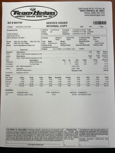 Inspection completed, oil and filter changed, total reconditioning $398.