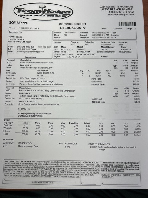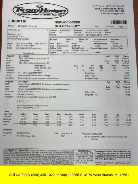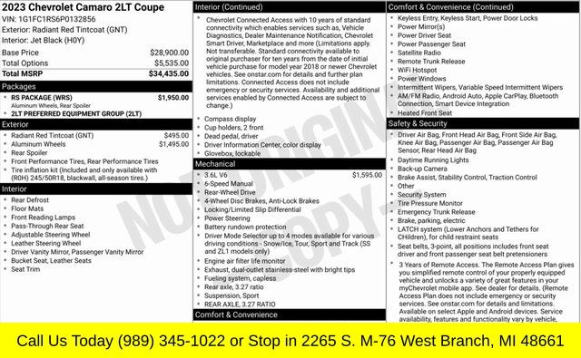 Inspection completed, oil and filter changed, performed recall N242447610, total reconditioning $469. Radiant Red Tintcoat 2023 Chevrolet Camaro 2LT 2LT RWD 6-Speed Manual 3.6L V6 DI **ONE OWNER**, **NON SMOKER**, **BLUETOOTH**, **REMOTE START**, **LOCAL TRADE IN**.