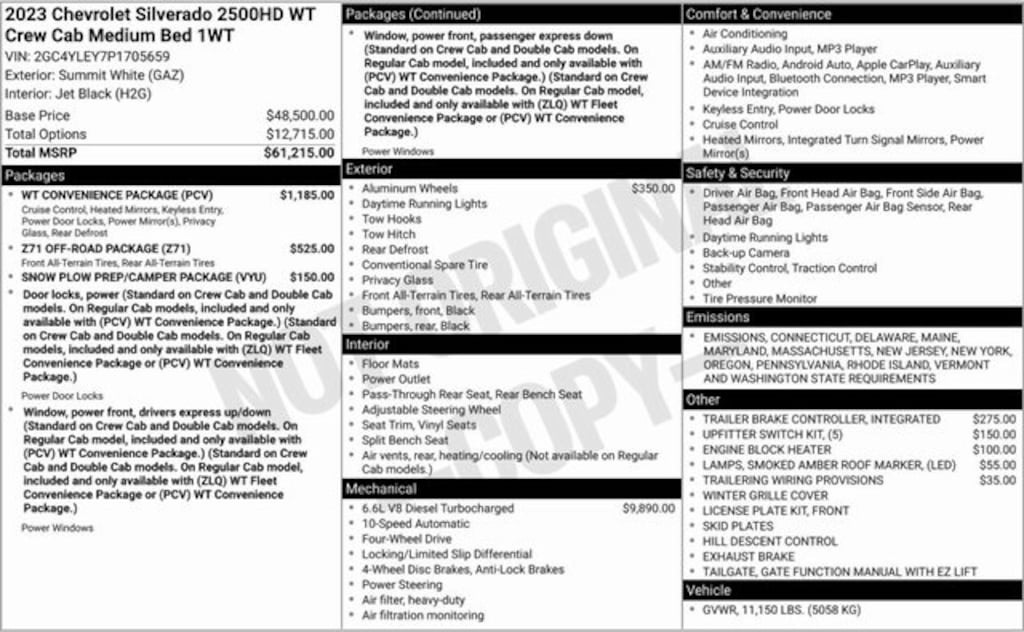 Summit White 2023 Chevrolet Silverado 2500HD Work Truck 4WD 10-Speed Automatic Duramax 6.6L V8 Turbodiesel 10-Speed Automatic, 4WD, Jet Black Vinyl, 170 Amp Alternator, 2-Speed Electronic Shift Transfer Case, 220 Amp Alternator, 3.5" Diagonal Monochromatic Display DIC, Black Front Bumper, Black Front Grille, Black Mirror Caps, Black Rear Bumper, Bluetooth® For Phone, Deep-Tinted Glass, Electric Rear-Window Defogger, Electronic Cruise Control w/Set & Resume Speed, EZ Lift Power Lock & Release Tailgate, Heated Vertical Trailering Mirrors, High-Visibility Vertical Trailering Mirrors, Hill Descent Control, Locking Tailgate, Manual Tailgate Function w/No EZ Lift, Manual Tilt-Wheel Steering Column, Off-Road Suspension, Power Rear Windows w/Express Down, Preferred Equipment Group 1WT, Rear 60/40 Folding Bench Seat (Folds Up), Remote Keyless Entry, Rubberized-Vinyl Floor Covering, Snow Plow Prep/Camper Package, Solar Absorbing Tinted Glass, Standard Tailgate, Suspension Package, WT Convenience Package, Z71 Off-Road Package.