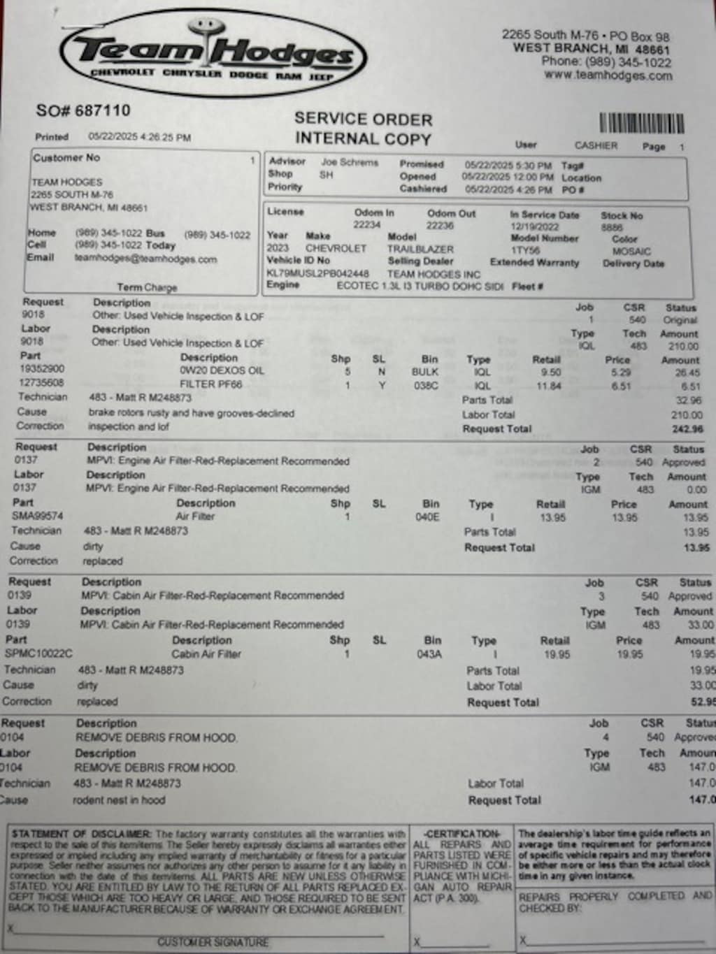 Inspection completed, oil and filter changed, both cabin and engine air filter replaced, total reconditioning cost $606. Mosaic Black Metallic 2023 Chevrolet TrailBlazer RS AWD 9-Speed Automatic 1.3L Ecotec Turbo DOHC SIDI w/VVT **BLUETOOTH**, **REMOTE START**, **LOCAL TRADE IN**, Heated Steering Wheel, Preferred Equipment Group 1RS.