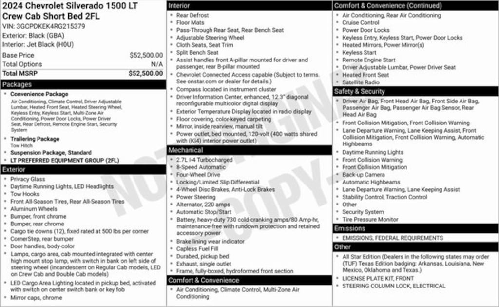Black 2024 Chevrolet Silverado 1500 LT 4WD 8-Speed Automatic 2.7L I4 Turbocharged DOHC 16V LEV3-SULEV30 310hp
