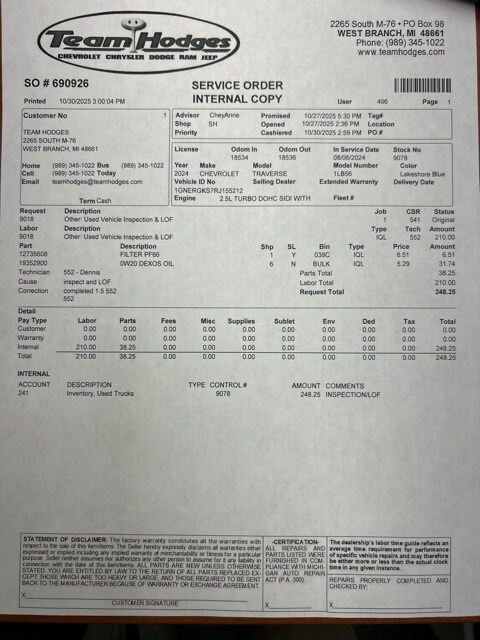 Inspection completed, oil and filter changed, total reconditioning $398.