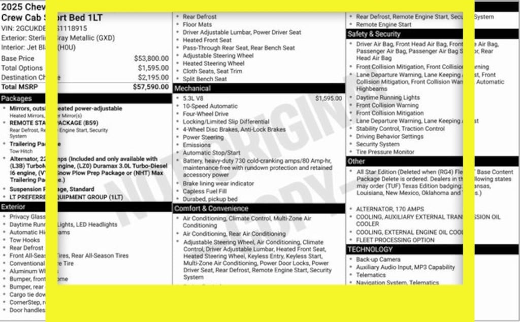 Sterling Gray Metallic 2025 Chevrolet Silverado 1500 LT LT1 4WD 10-Speed Automatic EcoTec3 5.3L V8 **BLUETOOTH**, **REMOTE START**, 10-Speed Automatic, 4WD, Black Cloth, 10-Way Power Driver Seat w/Lumbar, 12.3" Multicolor Reconfigurable Digital Display, 120-Volt Bed Mounted Power Outlet, 120-Volt Interior Power Outlet, All-Star Edition, Auto-Locking Rear Differential, Bluetooth® For Phone, Chrome Mirror Caps, Color-Keyed Carpeting Floor Covering, Convenience Package, Deep-Tinted Glass, Dual Rear USB Ports (Charge Only), Dual-Zone Automatic Climate Control, Electric Rear-Window Defogger, Electronic Cruise Control, EZ Lift Power Lock & Release Tailgate, Front Frame-Mounted Black Recovery Hooks, Front Rubberized Vinyl Floor Mats, HD Rear Vision Camera, Heated Driver & Front Outboard Passenger Seats, Heated Power-Adjustable Outside Mirrors, Heated Steering Wheel, Hitch Guidance, Inside Rear-View Mirror w/Tilt, Integrated Trailer Brake Controller, Keyless Open & Start, LED Cargo Area Lighting, Manual Tilt/Telescoping Steering Column, OnStar Services Capable, Power Front Windows w/Driver Express Up/Down, Power Front Windows w/Passenger Express Down, Power Rear Windows w/Express Down, Preferred Equipment Group 1LT, Rear 60/40 Folding Bench Seat (Folds Up), Rear Rubberized-Vinyl Floor Mats, Remote Start Package, Remote Vehicle Starter System, SiriusXM w/360L Trial Subscription, Standard Suspension Package, Standard Tailgate, Steering Wheel Audio Controls, Teen Driver, Theft Deterrent System (Unauthorized Entry), Tire Pressure Monitoring System, Trailering Package, Wi-Fi Hot Spot Capable, Wrapped Steering Wheel.