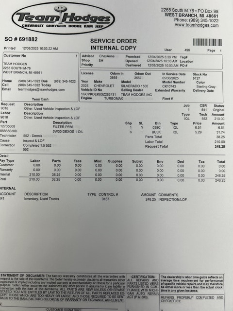 Inspection completed, oil and filter changed, total reconditioning cost $398.