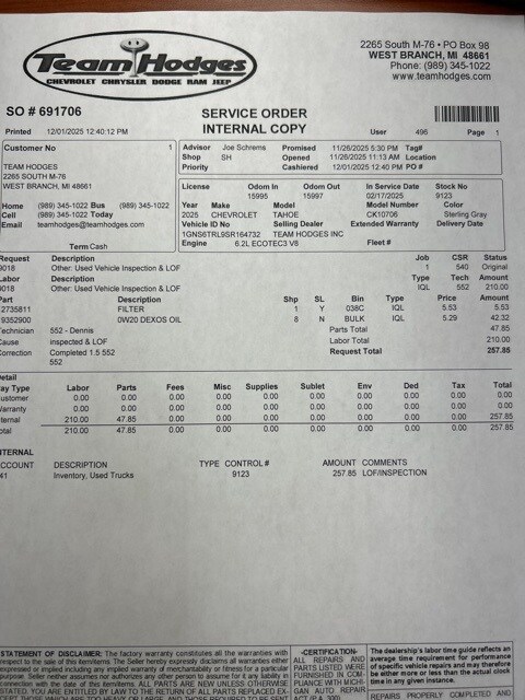 Inspection completed, oil and filter changed, total reconditioning $404.