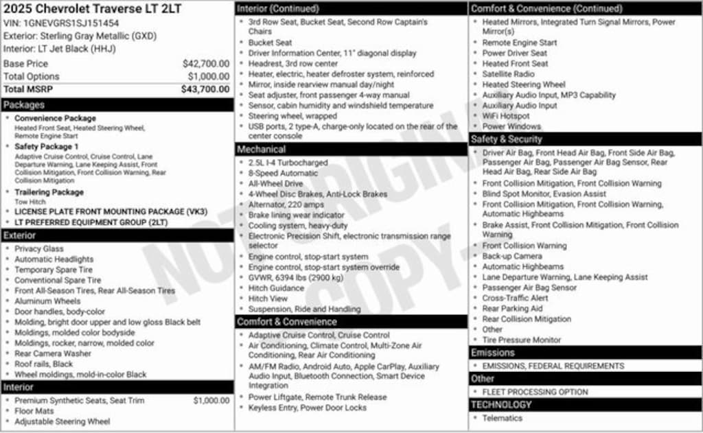 Sterling Gray Metallic 2025 Chevrolet Traverse LT 2LT AWD 8-Speed Automatic 2.5L DOHC **BLUETOOTH**, **REMOTE START**, AWD, Navigation System, Preferred Equipment Group 2LT.