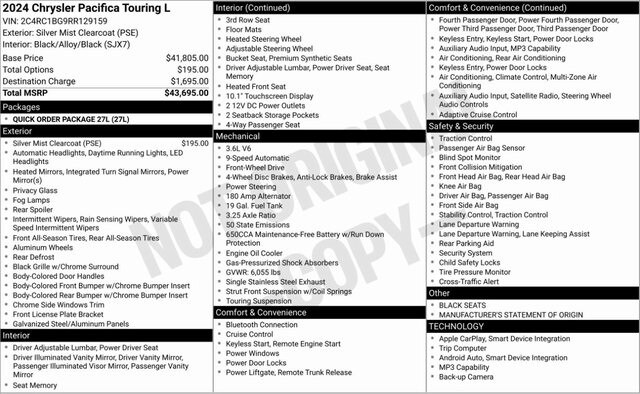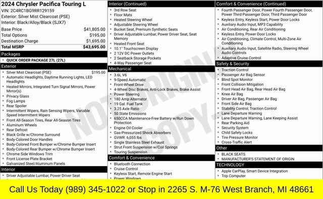 Silver Mist Clearcoat 2024 Chrysler Pacifica Touring L FWD 9-Speed 948TE Automatic 3.6L V6 24V VVT Quick Order Package 27L.