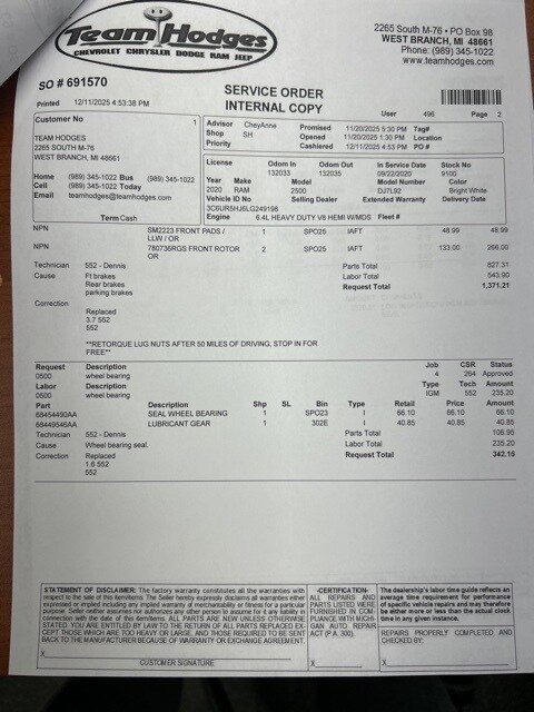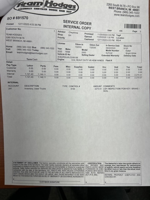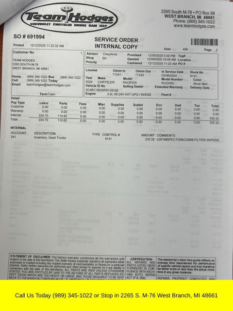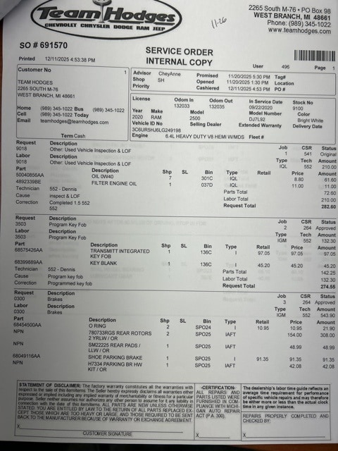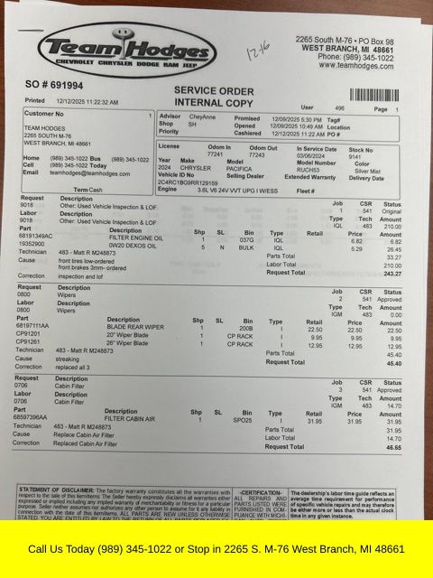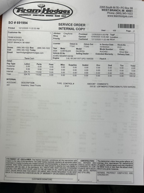 Inspection completed, oil and filter changed, replace all wiper blades, replaced cabin air filter, total reconditioning $485.