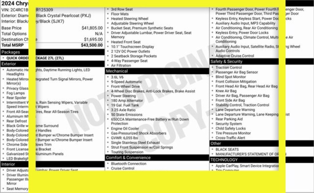 Diamond Black Crystal Pearlcoat 2024 Chrysler Pacifica Touring L FWD 9-Speed 948TE Automatic 3.6L V6 24V VVT **BLUETOOTH**, **REMOTE START**, Quick Order Package 27L.