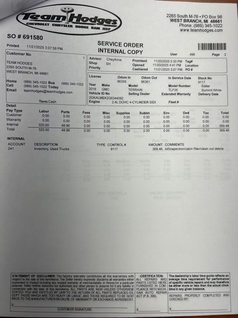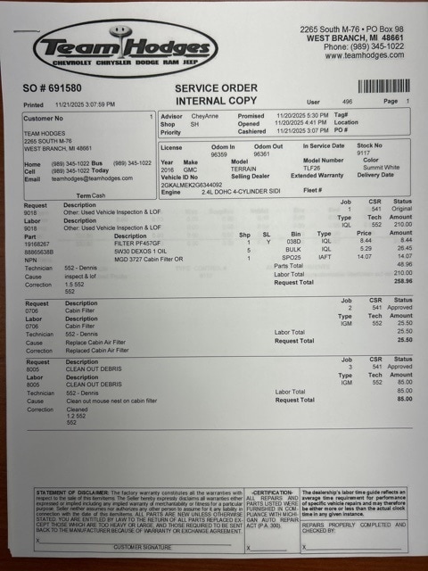 Inspection completed, oil and filter changed, replaced cabin air filter, total reconditioning $519.