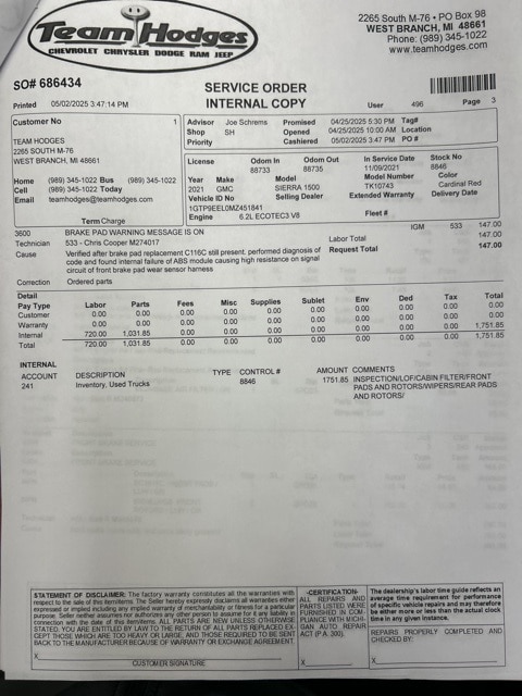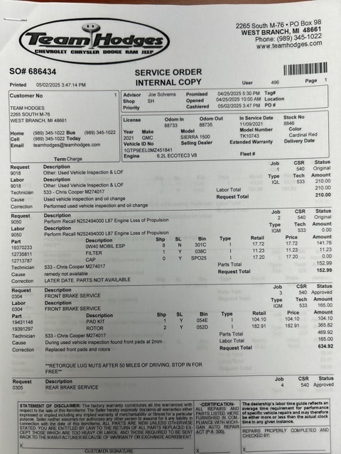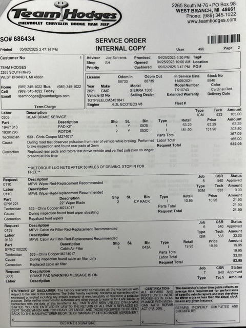 Inspection completed, oil and filter changed, replaced BOTH front and rear brake pads and rotors, replaced wiper blades, replaced cabin air filter, total reconditioning $1901.