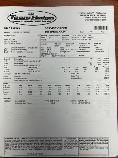 Inspection completed, oil and filter changed, total reconditioning cost $444.00