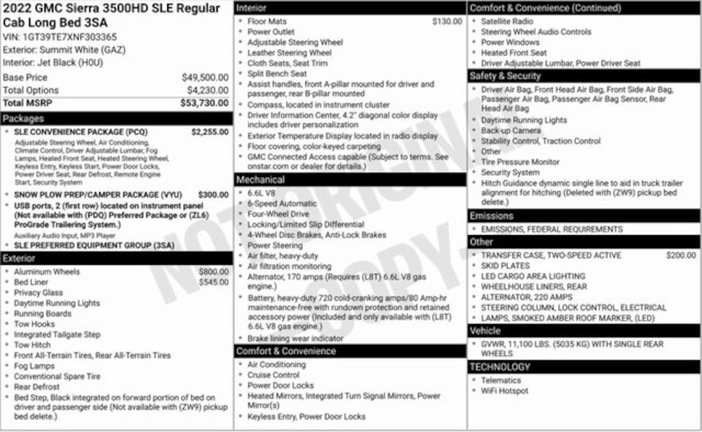 Inspection completed, oil and filter changed, replaced tailgate switch, replaced cabin air filter, total reconditioning $539. Summit White 2022 GMC Sierra 3500HD SLE 4WD 6-Speed Automatic 6.6L V8 **LOCAL TRADE IN**, 6-Speed Automatic, 4WD, Black Cloth, 10-Way Power Driver Seat Adjuster w/Lumbar, 12-Volt Rear Auxiliary Power Outlet, 2-Speed Electronic Shift Transfer Case, 220 Amp Alternator, Chrome Surround Grille w/High Gloss Black Mesh, Compass Located In Instrument Cluster, Deep-Tinted Glass, Dual-Zone Automatic Climate Control, Electric Rear-Window Defogger, Electrical Lock Control Steering Column, GMC Connected Access Capable, Heated Driver & Front Outboard Passenger Seats, Heated Steering Wheel, Integrated Trailer Brake Controller, Keyless Open & Start, LED Cargo Area Lighting, LED Fog Lamps, Manual Tilt Wheel Steering Column, Manual Tilt-Wheel/Telescoping Steering Column, OnStar & GMC Connected Services Capable, Power Door Locks, Power Front Windows w/Driver Express Up/Down, Power Front Windows w/Passenger Express Down, Preferred Equipment Group 3SA, Remote Keyless Entry, Remote Vehicle Starter System, SiriusXM Radio, SLE Convenience Package, Snow Plow Prep/Camper Package, Steering Wheel Audio Controls, Suspension Package, Unauthorized Entry Theft-Deterrent System, Wi-Fi Hotspot Capable.