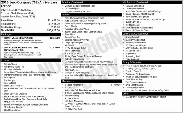 Black Clearcoat 2016 Jeep Compass Sport 75th Anniversary Edition 4WD 6-Speed Automatic 2.4L I4 DOHC 16V Dual VVT