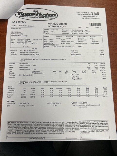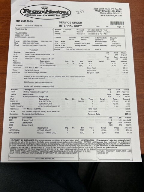 Inspection completed, oil and filter changed, replaced start/stop battery, replaced front pads and rotors, replaced a tire pressure sensor, total reconditioning $1003.