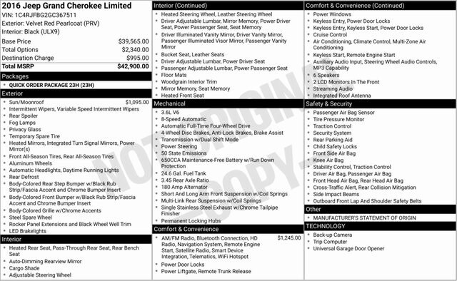 Velvet Red Pearlcoat 2016 Jeep Grand Cherokee Limited 4WD 8-Speed Automatic 3.6L V6 24V VVT