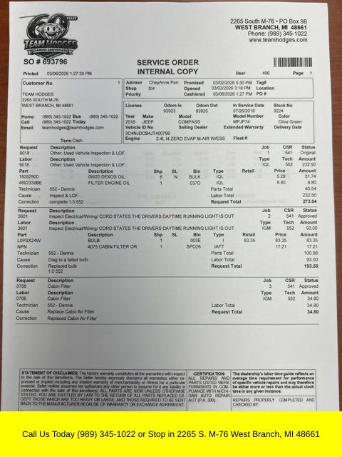 Reconditioning complete, oil and filter changed, replaced a bulb, replaced cabin air filter, total reconditioning $651.