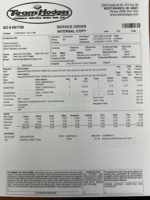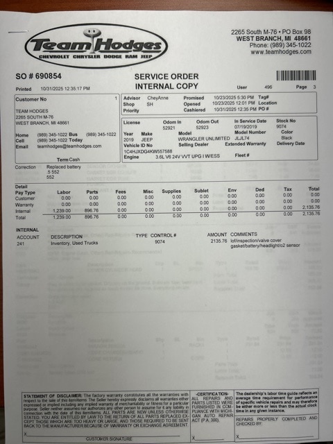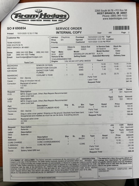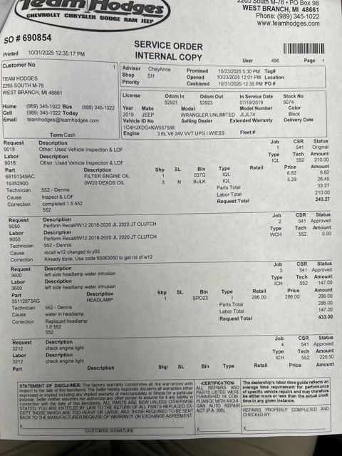 Inspection completed, replaced O2 sensor, replaced valve cover, replaced battery, oil and filter changed, performed recall, replaced headlamp, replaced 2 weather strips and 1 visor, total reconditioning $3,037.