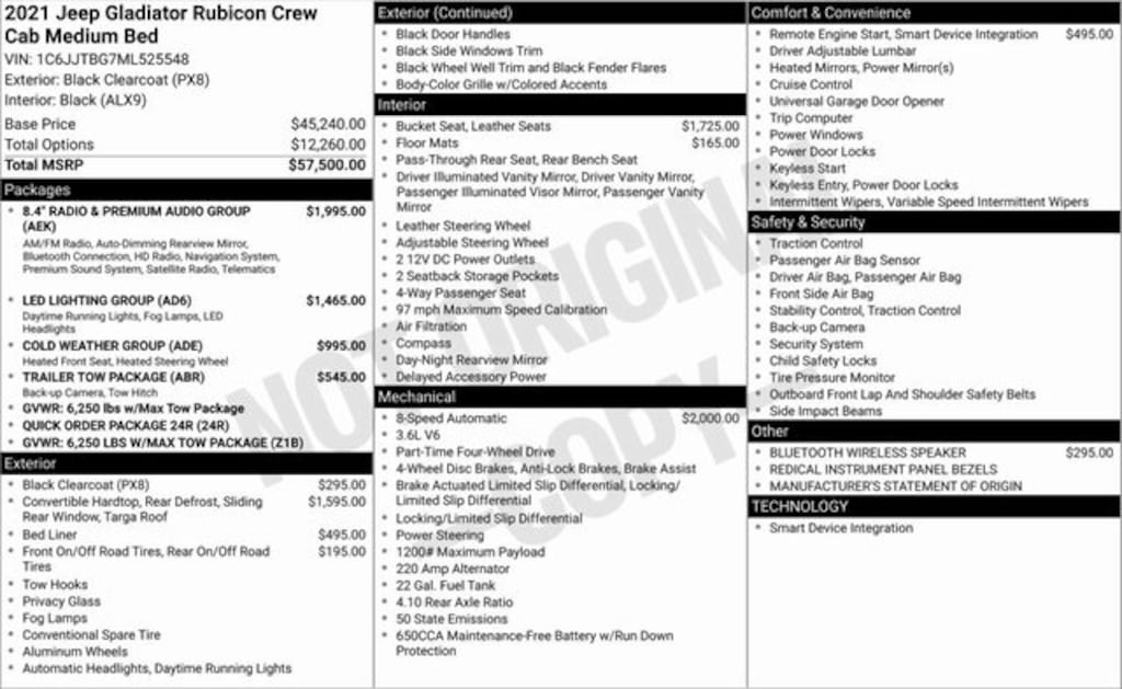 Black Clearcoat 2021 Jeep Gladiator Rubicon 4WD 8-Speed Automatic 3.6L V6 24V VVT **ONE OWNER**, **NON SMOKER**, **BLUETOOTH**, **REMOTE START**, 1-Year SiriusXM Guardian Trial, 240 Amp Alternator, 5-Year SiriusXM Traffic Service, 5-Year SiriusXM Travel Link Service, 8.4" Radio & Premium Audio Group, 8.4" Touchscreen Display, Alpine Premium Audio System, Auto-Dimming Rear-View Mirror, Class IV Hitch Receiver, Cold Weather Group, Daytime Running Lamps LED Accents, Emergency/Assistance Call, For Details, Visit DriveUconnect.com, Front LED Fog Lamps, GPS Navigation, GVWR: 6,250 lbs w/Max Tow Package, HD Radio, Heated Front Seats, Heated Steering Wheel, Heavy-Duty Engine Cooling, LED Lighting Group, LED Park Turn Lamps, LED Premium Reflector Headlamps, LED Taillamps, Quick Order Package 24R, Radio: Uconnect 4C Nav w/8.4" Display, SiriusXM Traffic Plus, SiriusXM Travel Link, Trailer Hitch Zoom, Trailer Tow Package.