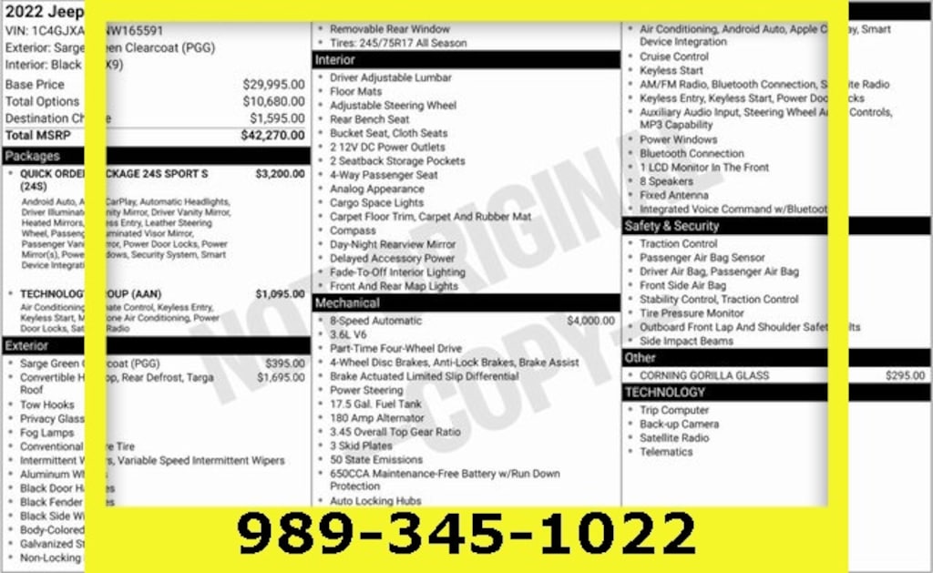 Sarge Green Clearcoat 2022 Jeep Wrangler Sport S 4WD 8-Speed Automatic 3.6L V6 24V VVT 7.0" Touchscreen Display, Air Conditioning, Air Conditioning w/Auto Temperature Control, Air Filtering, Apple CarPlay, Automatic Headlamps, Cluster 7.0" TFT Color Display, Deep Tint Sunscreen Windows, For More Info, Call 800-643-2112, Front 1-Touch Down Power Windows, Front Door Locks 2-Door Passive Entry, Global Telematics Box Module (TBM), Google Android Auto, GPS Antenna Input, Integrated Center Stack Radio, Integrated Voice Command w/Bluetooth, Leather Wrapped Steering Wheel, Power Heated Mirrors, Quick Order Package 24S Sport S (DISC), R1234YF A/C Refrigerant, Radio: Uconnect 4 w/7" Display, Remote Keyless Entry, Security Alarm, SiriusXM Guardian-Included Trial (B), SiriusXM Radio Service, SiriusXM Satellite Radio, Speed Sensitive Power Locks, Sport S, Sun Visors w/Illuminated Vanity Mirrors, Technology Group, USB Host Flip, Wheels: 17" x 7.5" Tech Silver Aluminum.