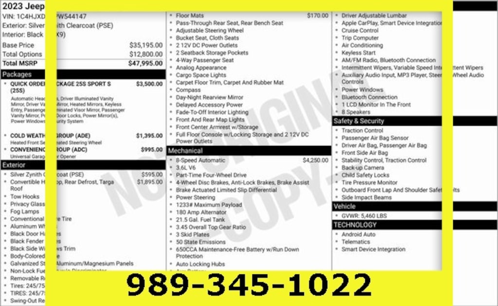 Silver Zynith Clearcoat 2023 Jeep Wrangler Sport S 4WD 8-Speed Automatic 3.6L V6 24V VVT **BLUETOOTH**, Automatic Headlamps, Cold Weather Group, Convenience Group, Deep Tint Sunscreen Windows, Front 1-Touch Down Power Windows, Heated Front Seats, Heated Steering Wheel, Power Heated Mirrors, Premium Wrapped Steering Wheel, Quick Order Package 25S Sport S, Remote Keyless Entry, Security Alarm, Speed Sensitive Power Locks, Sport S, Sun Visors w/Illuminated Vanity Mirrors, Universal Garage Door Opener, Wheels: 17" x 7.5 Tech Silver Aluminum.