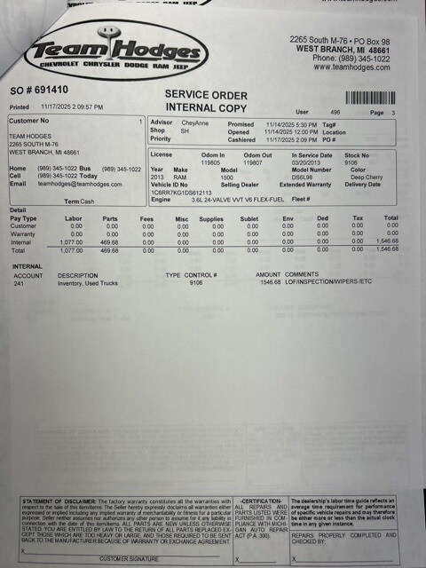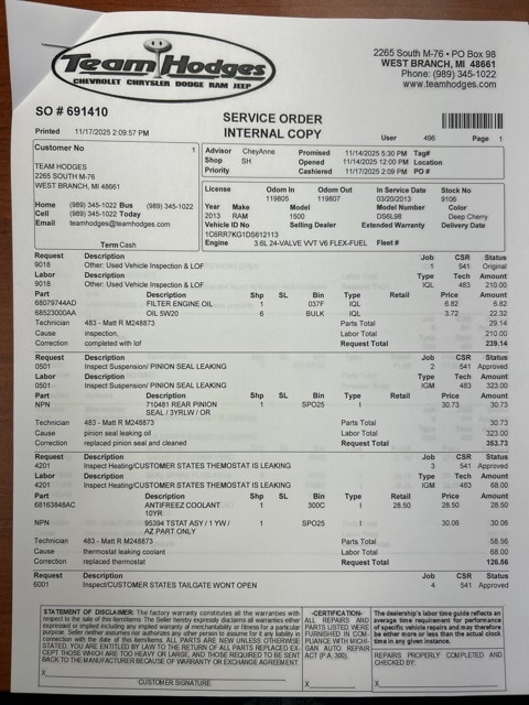 Inspection completed oil and filter changed, replaced pinion seal, replaced thermostat, adjusted tailgate, replaced wiper blades, replaced valve cover gaskets, total reconditioning $1,697.