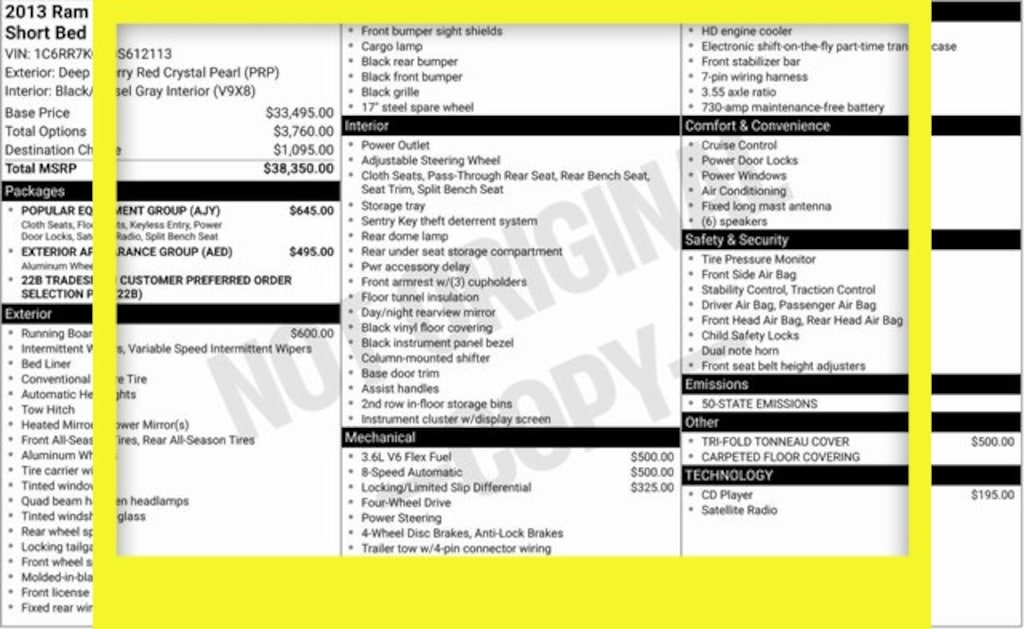 40/20/40 Split Bench Seat, Bright Front Bumper, Bright Grille, Bright Rear Bumper, Class IV Receiver Hitch, Cloth 40/20/40 Bench Seat, Exterior Appearance Group (DISC), For More Info, Call 800-643-2112, Front Armrest w/Three Cupholders, Popular Equipment Group, Quick Order Package 22B Tradesman, Rear Folding Seat, Remote Keyless Entry w/All-Secure, SIRIUSXM Satellite Radio, Spray In Bedliner, Storage Tray, Tradesman Package, Wheels: 17" x 7" Aluminum (DISC).