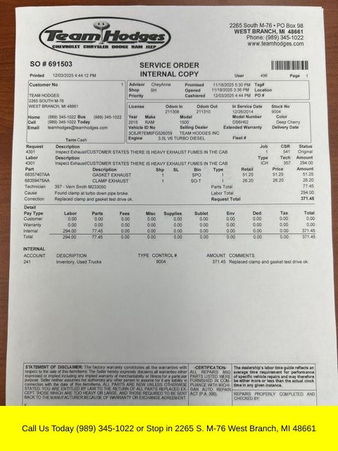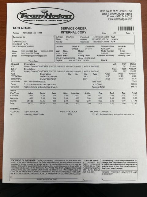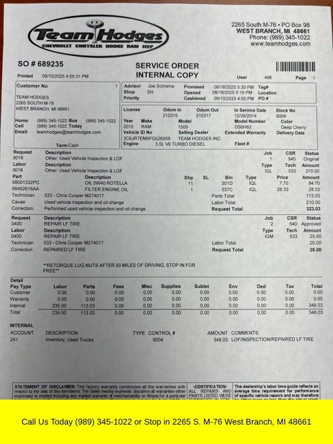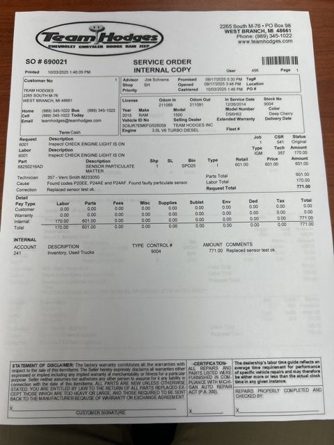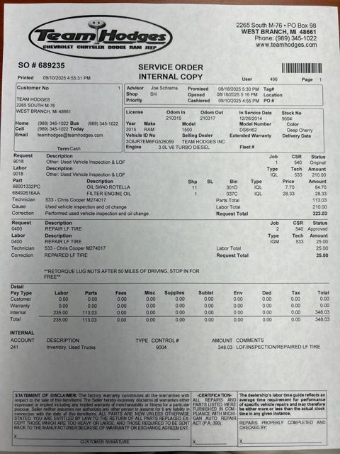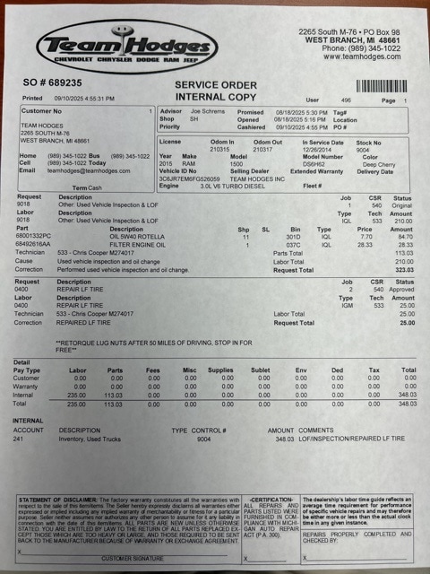Inspection completed, oil and filter changed, repaired LF tire, replaced particulate sensor, replaced exhaust clamp and gasket total reconditioning $1,640.