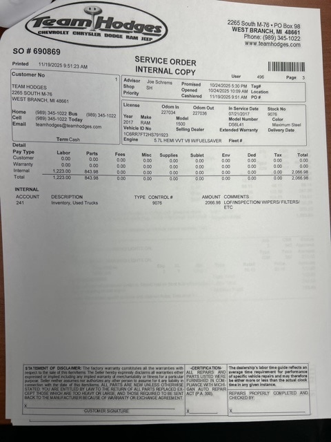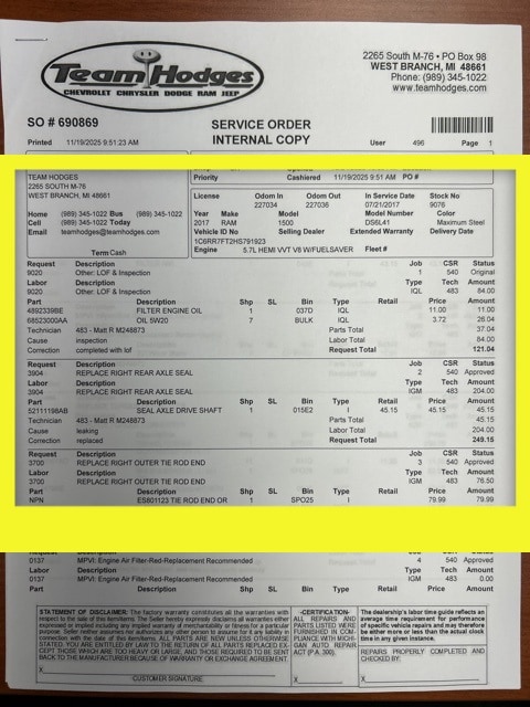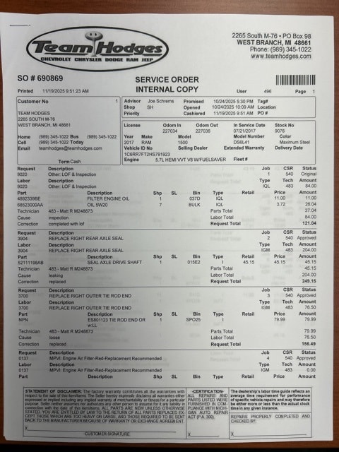 Inspection completed, oil and filter changed, replaced right rear axle seal, replaced right outer tie rod end, replaced engine air filter, replaced wiper blades, replaced torque converter, Total reconditioning cost $2,217.