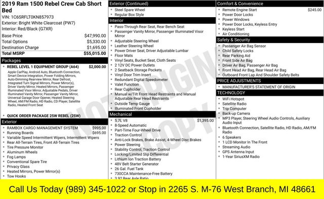 Bright White Clearcoat 2019 Ram 1500 Rebel 4WD 8-Speed Automatic HEMI 5.7L V8 Multi Displacement VVT