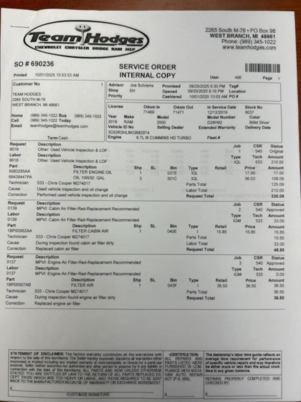 Inspection completed, oil and filter changed, cabin and engine air filter replaced, total reconditioning cost $570.